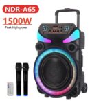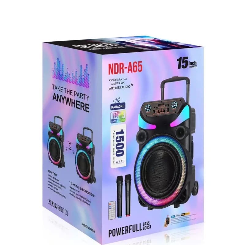NDR-A65 15″ PORTABLE SOUND SYSTEM 1500W DUAL WIRELESS MIC AND REMOTE BLUETOOTH WIRELESS SPEAKER