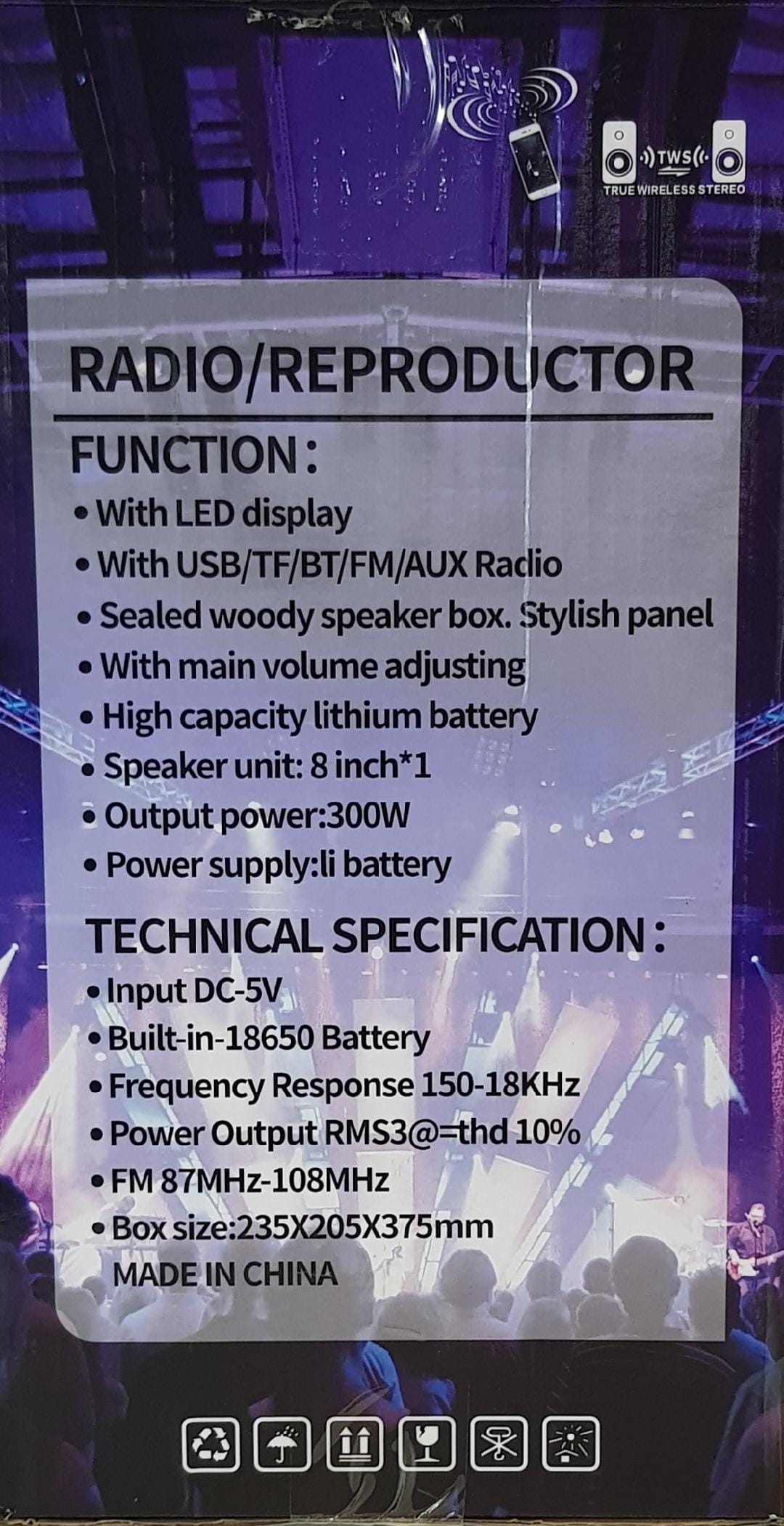 TWS NDRP55 8″ inch Speaker With Extra Bass, Blutooth/USB/TF/FM/AUX Radio Wireless 300W Output with Mic – Spantik
